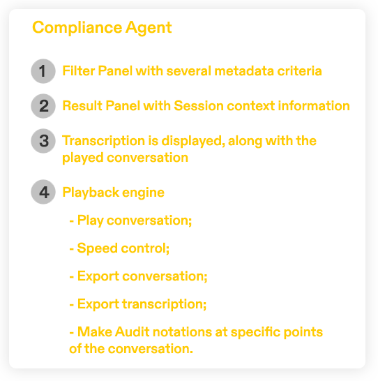 Every action is recorded, transcribed, annotated, and exportable—with full traceability by user and timestamp to ensure compliance. Powered by the NeoPath CCS AI Engine, the platform enables real-time monitoring and analysis of ongoing conversations.